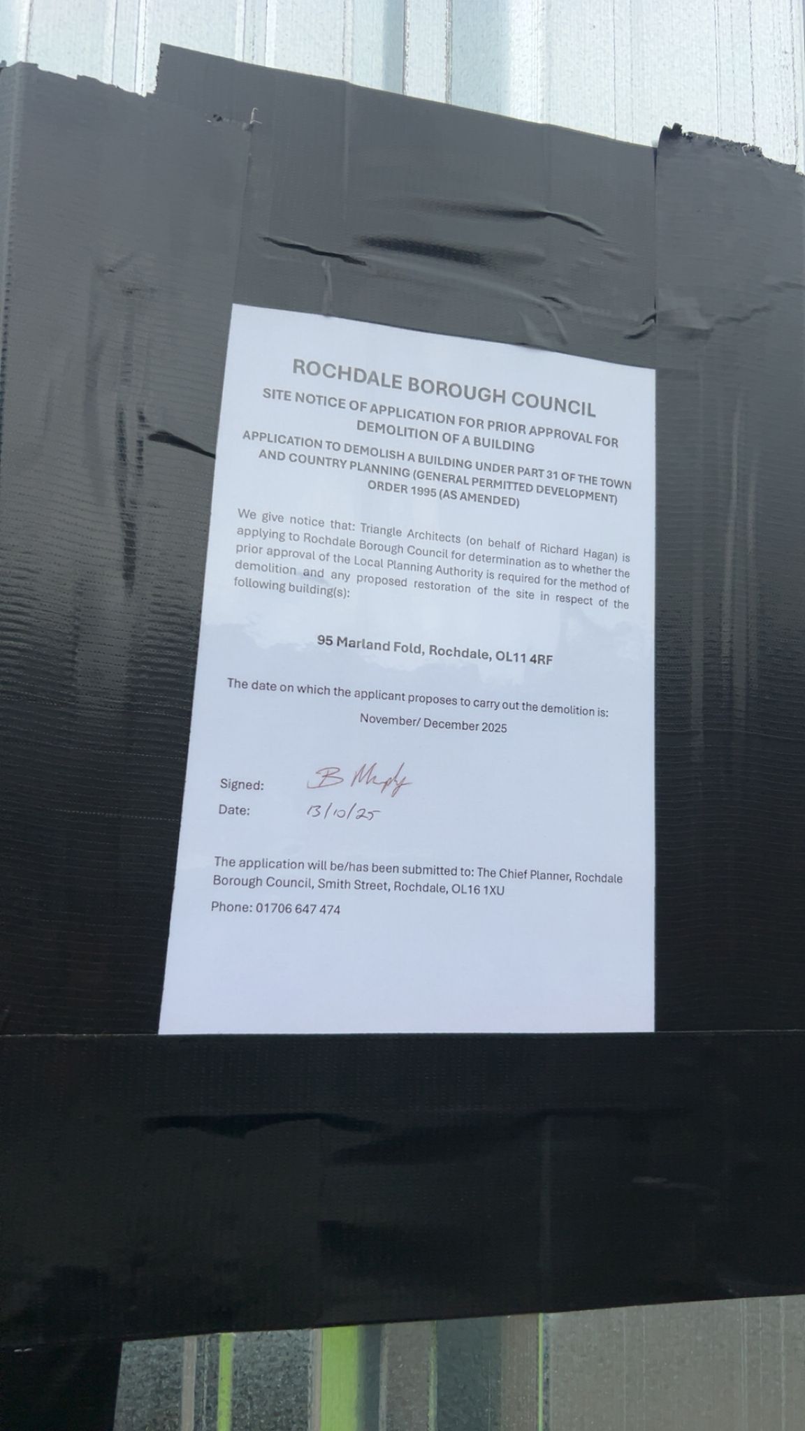 Reference 25/01082/DEM Application type Prior approval Part 11 Class B: Demolition of buildings Site address 95 Marland Fold Rochdale OL11 4RF Description Application for prior approval for the demolition of dwelling Status Decision Made Decision Approve with Conditions
