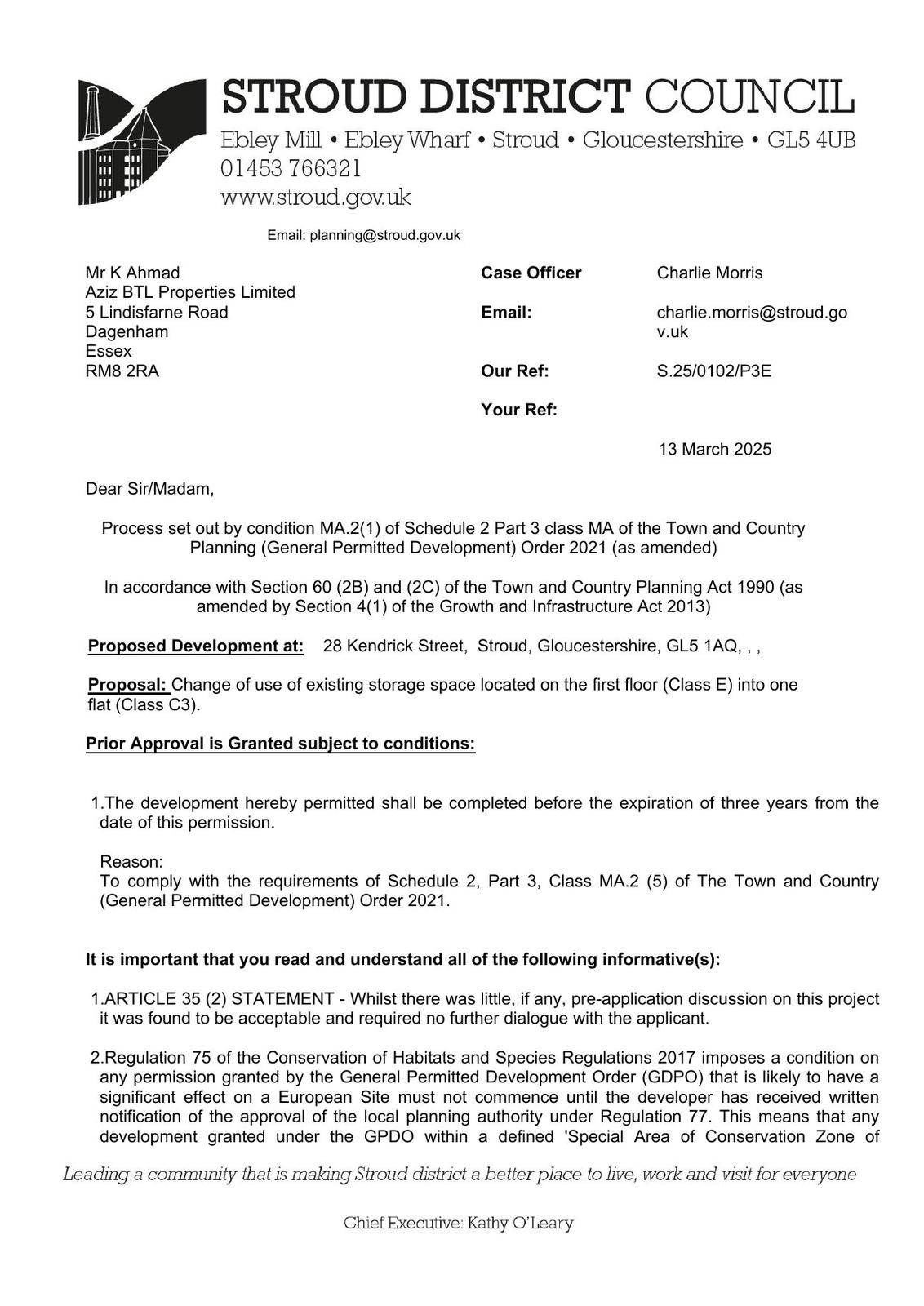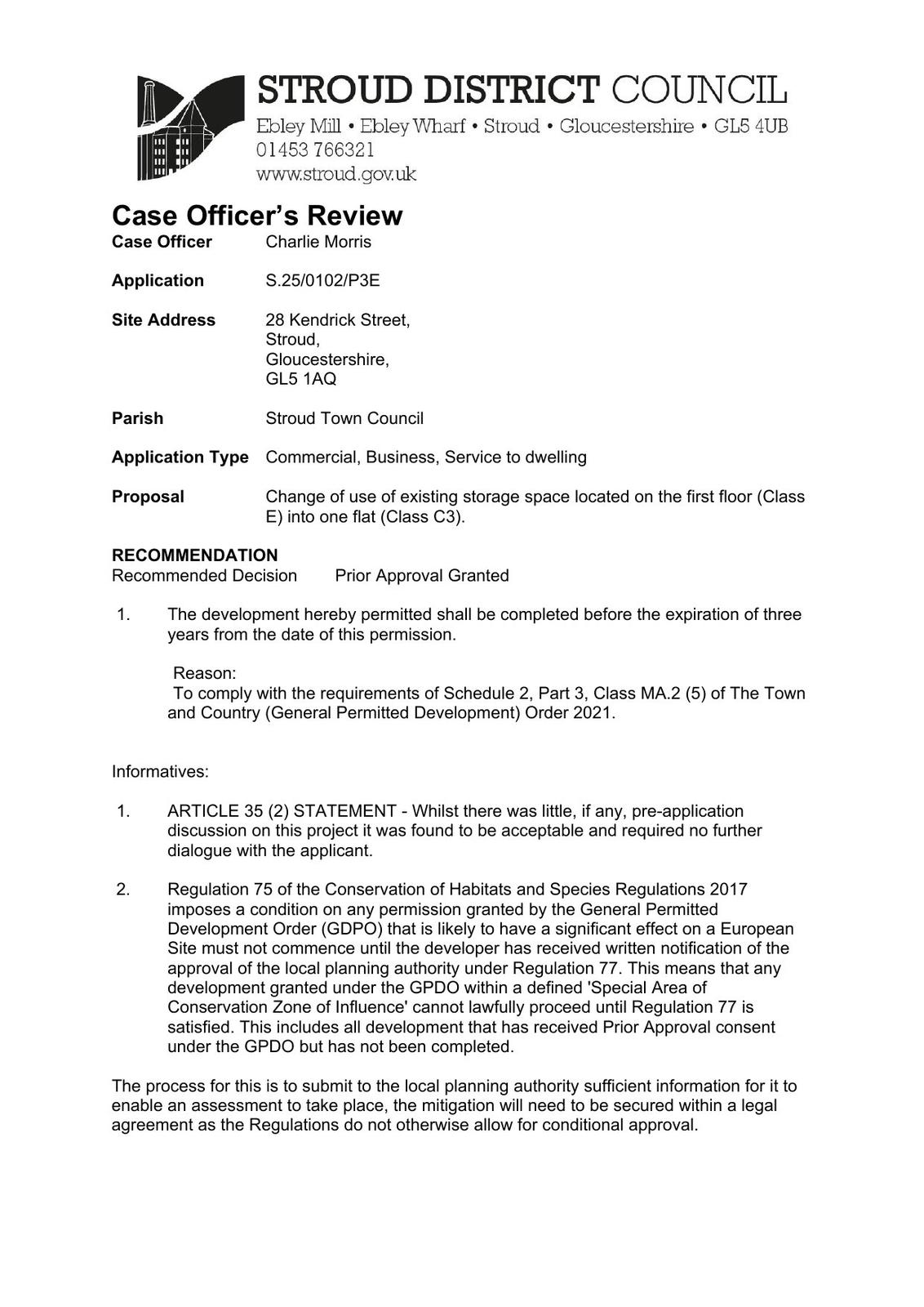Change of use of existing storage space located on the first floor (Class E) into one flat (Class C3).