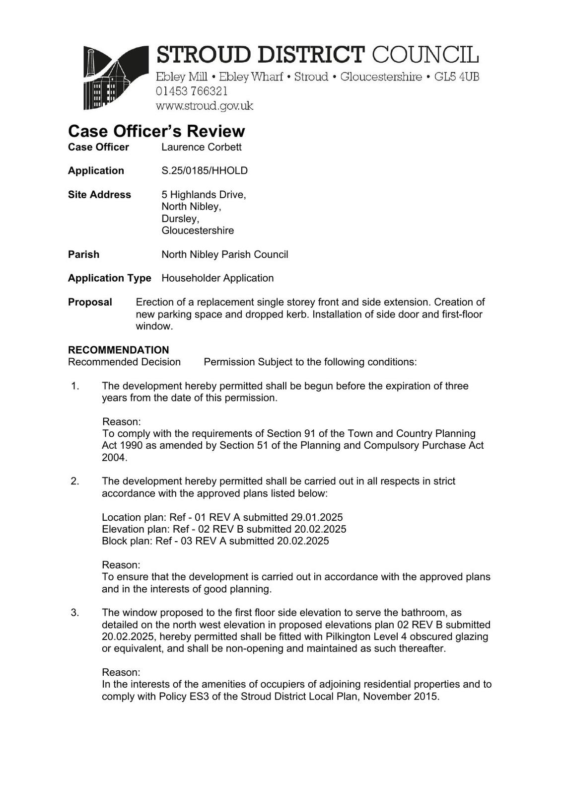 Erection of a replacement single storey front and side extension. Creation of new parking space and dropped kerb. Installation of side door and first-floor window.